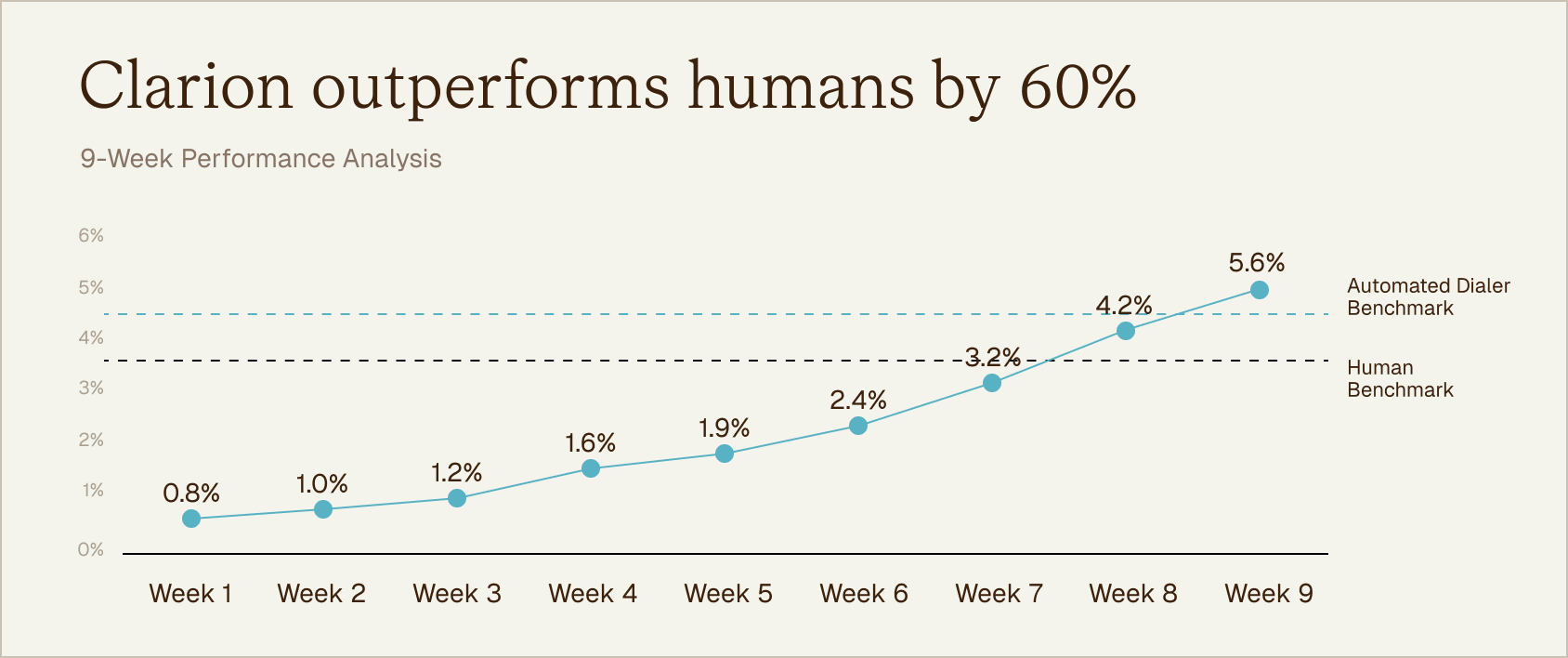 By December 2025, Clarion’s agent reached a 5.62% conversion rate, compared with a 3.5% human benchmark and a 4.3% automated dialer benchmark. What began at 75 calls per day scaled to 20,000 VHA calls per month, with a peak of 13,000 calls handled in a single day.