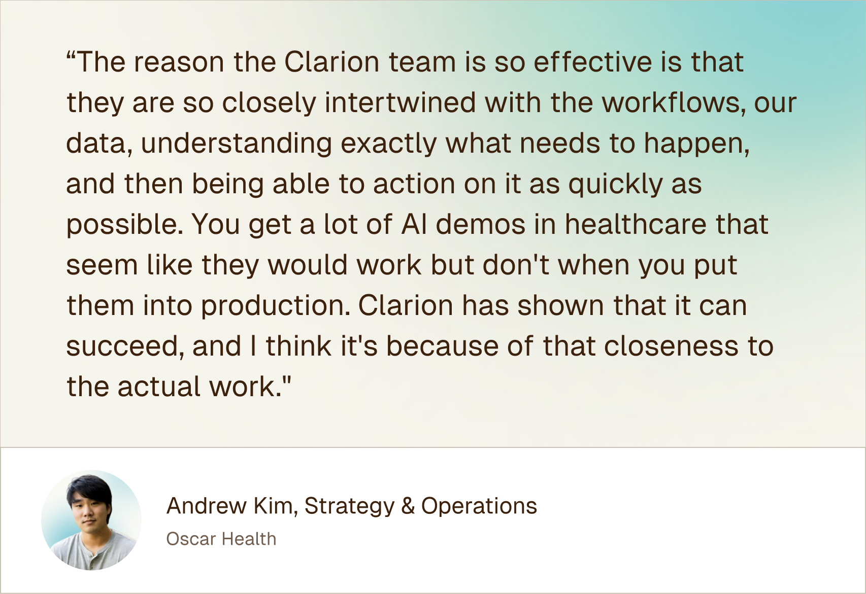 Oscar Health is a Fortune 500 health insurance company serving nearly three million patients. They run proprietary AI models for claims processing and risk adjustment. When they evaluate an AI vendor, they know the difference between a compelling demo and a system that performs in production.