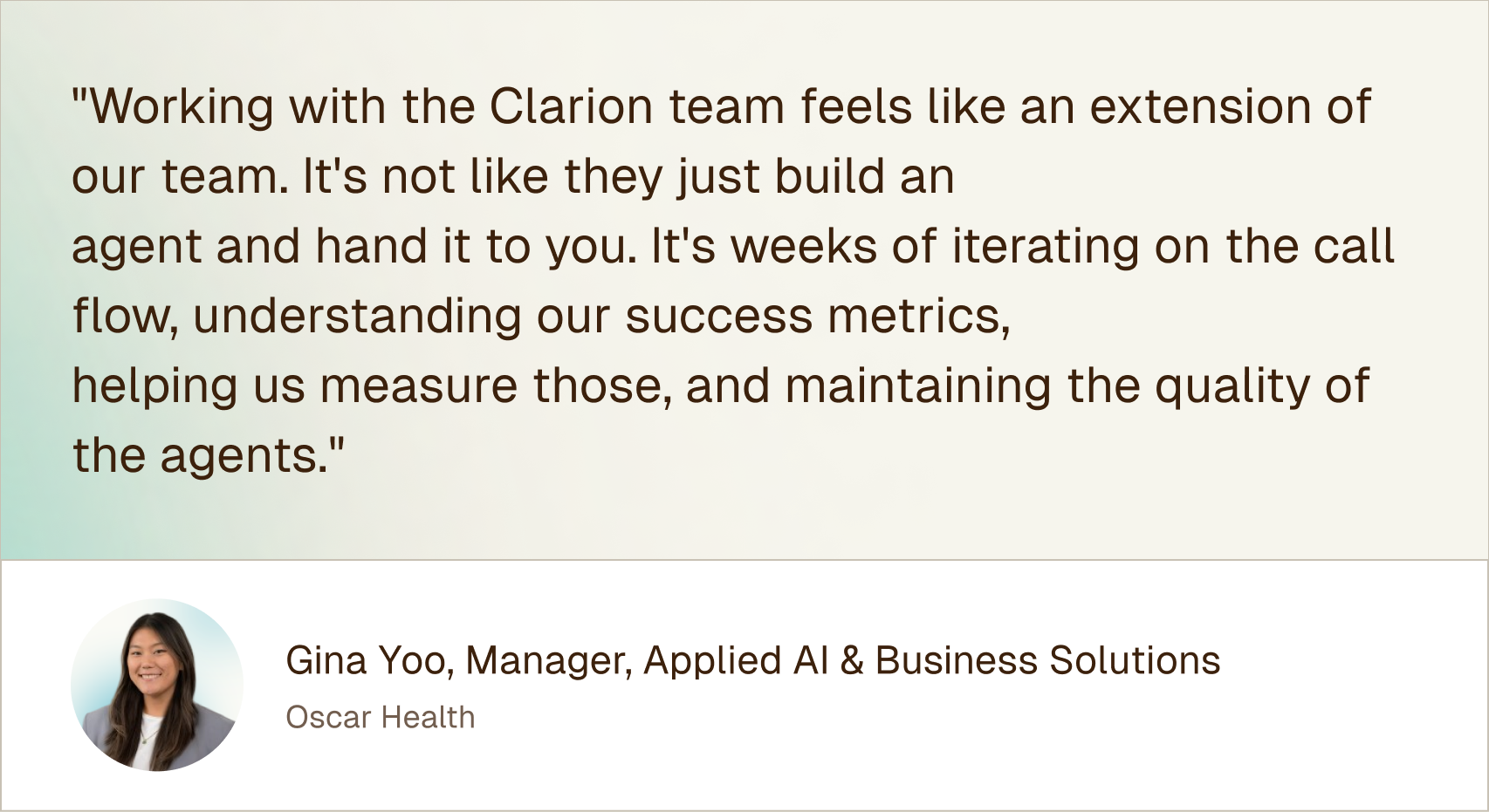 In September 2024, Oscar Health chose a different path. They partnered with Clarion to automate outbound scheduling calls for their Virtual Health Assessment program. The first week, the AI converted less than 1% of calls. Oscar's human team was at 3.5%. The gap was real, and expected. What happened next is the point. Through 100+ iterations of rigorous conversation engineering and a phased deployment process built for a clinical setting, Clarion's agent reached 5.62% conversion, 40% above the human benchmark. Today it handles over 40,000 calls per month across four active use cases. Getting AI to work in healthcare is not a launch. It's a practice.