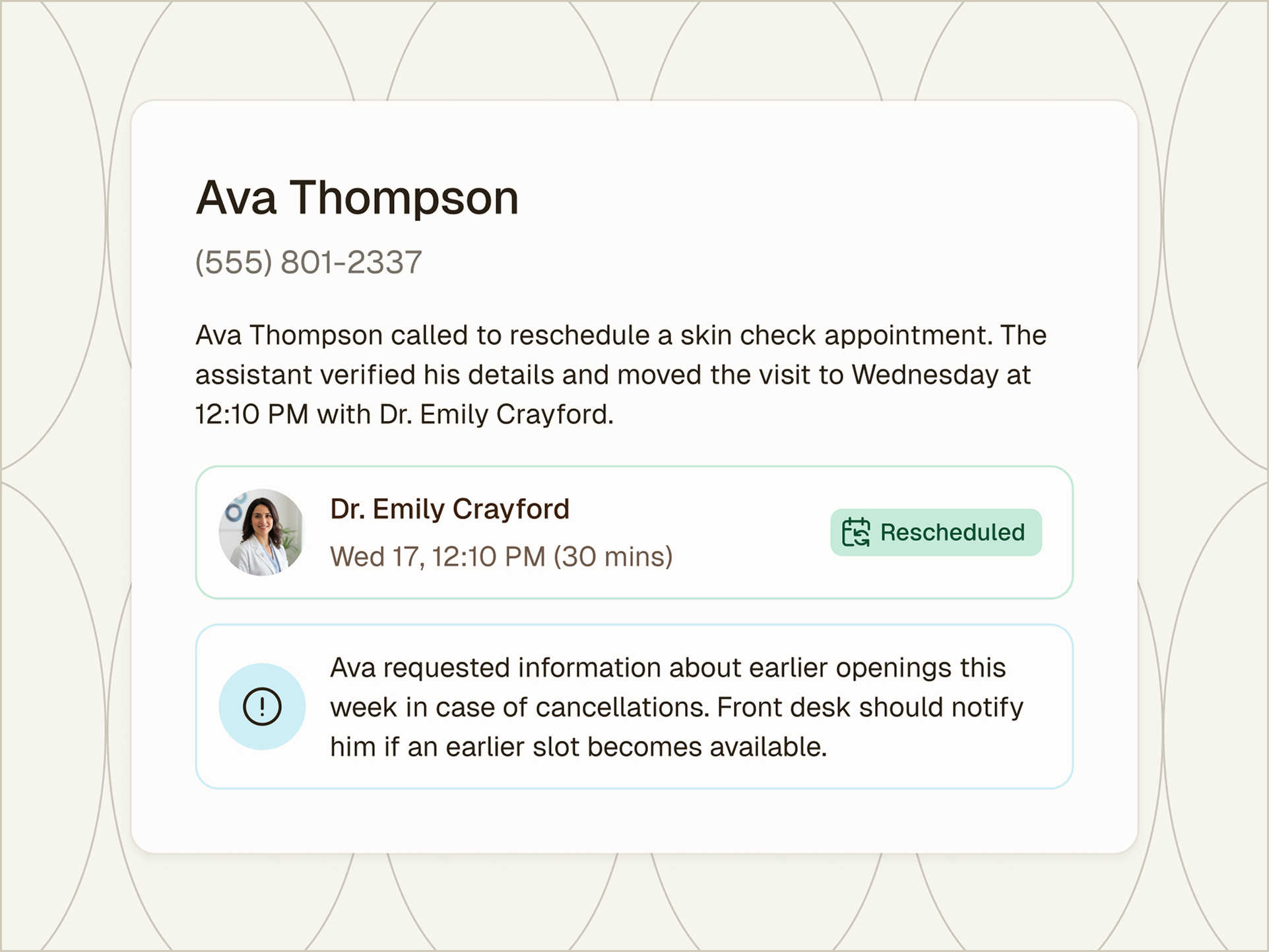 Deliver personalized, empathetic patient experiences with an AI that understands your dermatology workflows and patient needs, just like your best front-desk team member.